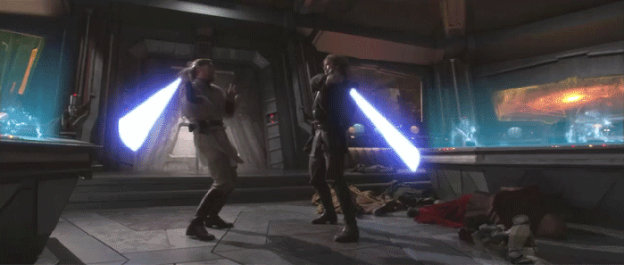 Meanwhile, Obi-Wan and Anakin’s fight rages on to the point where they actually do stop to exchange a few words. Unfortunately they’re even dumber than the words that started the fight in the first place. Obi-Wan tries to apologize saying he’s failed Anakin, which let’s be real, he kinda did, but not to this extent. Anakin spouts some bologna about how the Jedi were plotting to take over the Senate, a plot that he knows for a fact wasn’t true because the only source was Palpatine, WHO IS EVIL, and Obi-Wan says as much.